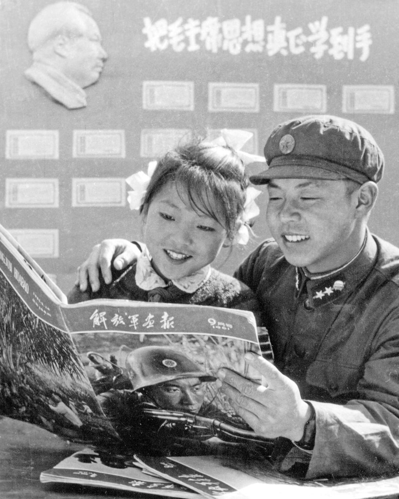 雷锋和本西路小学少先队员陈雅娟一起看《解放军画报》