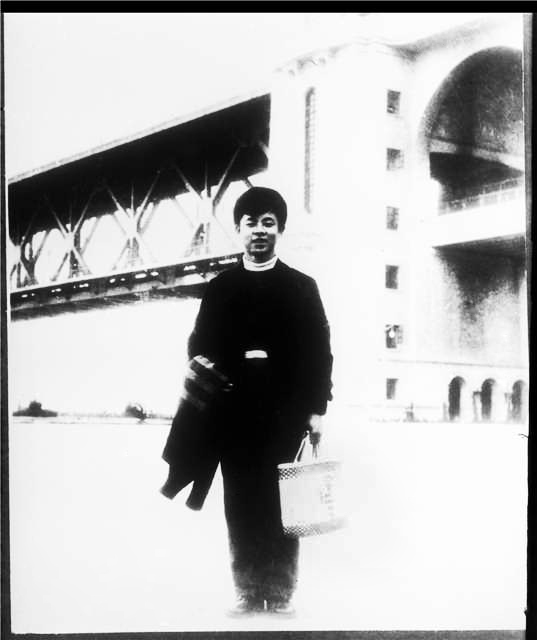 雷锋北上鞍钢,经过武汉时在武汉长江大桥留影。